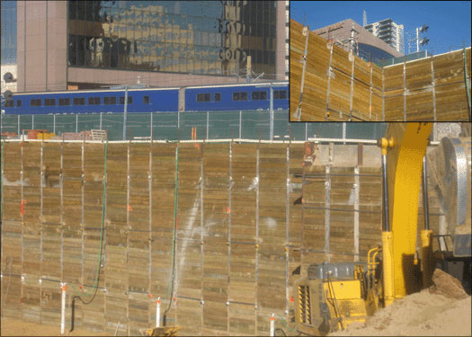 The design for the shoring of this 45’ deep excavation, in the downtown San Diego area was complicated by the many existing utilities and the surcharge placed directly on top of the retaining wall by the Rail Road.